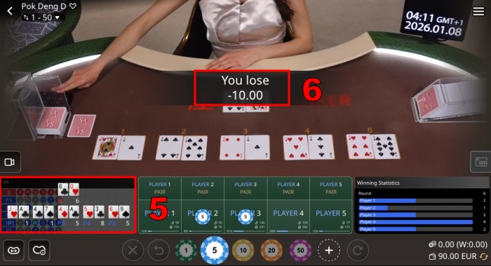 Step 3: After the betting time is up… The dealer will reveal all 5 player cards and then reveal their own cards later. The results are: Player 1 = 1 point, Player 2 = 1 point, Player 3 = 5 points, Player 4 = 8 points, and Player 5 = 5 points. The dealer’s card is 6 points.