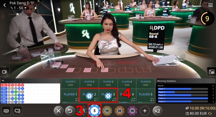Step 2: Once you enter the Pok Deng betting room, you will have 18 seconds to place your bets. You can place bets on any of the Player 1-5 slots, or all of them. In this example, we will choose Players 2 and 3, placing 5 coins on each slot.